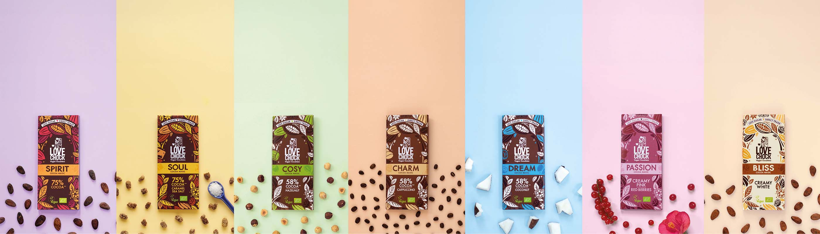 Lovechock is 100% organic, fits well into a vegan diet, contains flavonoids and is also dairy, soy and gluten-free. "No refined sugar" is part of our mission. Our chocolate is sweetened with inulin, and we use as little as possible. Moreover, all our packaging has been certified as "home compostable" since 2011. Yes, even the transparent foil is made of wood cellulose, which breaks down in your home compost within just 90 days.