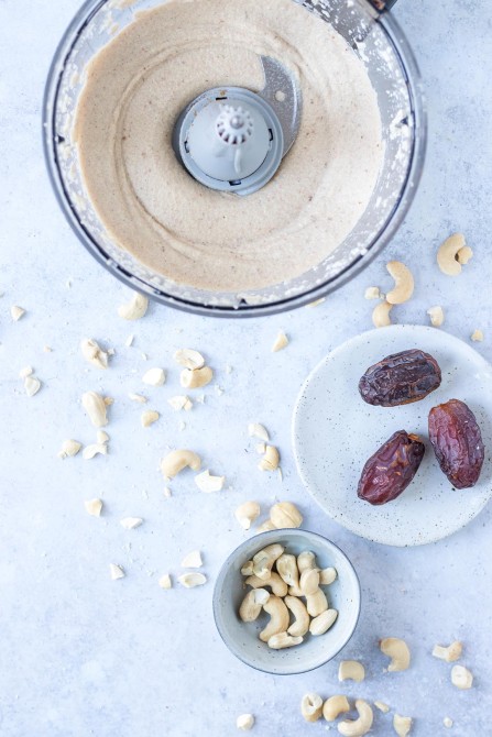- Put the cashew nuts together with the water, the medjoul dates and the vanilla extract in the food processor. Mix 7-10 minutes until it is creamy and soft.