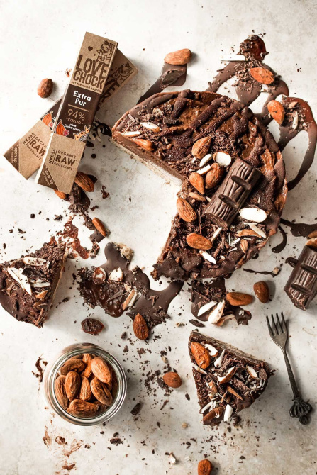 - The liquid chocolate can now be filled into a piping bag and then poured into lines over the cake. As an extra topping, there add a few almonds. For this, you can also chop a few almonds and spread them all over. If you like it more chocolaty, you can still add a few chocolate chunks.