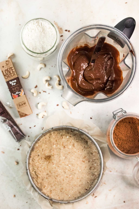 - Place all ingredients for the base into a powerful food processor and mix them at the highest level until a homogeneous, solid mass is obtained. Importantly, the dates have been soaked overnight so they are soft enough. Then you place the dough into the baking tin. The bottom should be covered with a baking paper, which later facilitates the extraction of the cake from the baking tin.