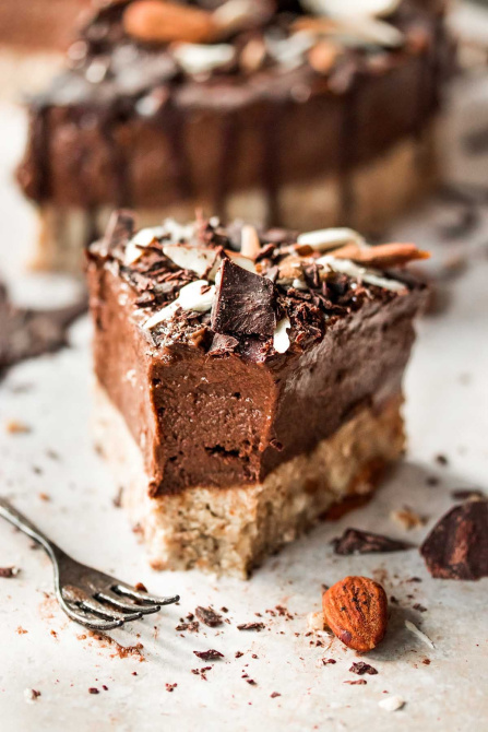 - Now you can prepare the cream layer. Therefore, place the dates, the 3 bananas, the cocoa powder and the almond milk first in a powerful blender and blend at the highest level to a creamy mass. Finally, add 4 tablespoons almond flour to thicken the cream. The finished chocolate cream can now be added as a second layer in the baking tin.