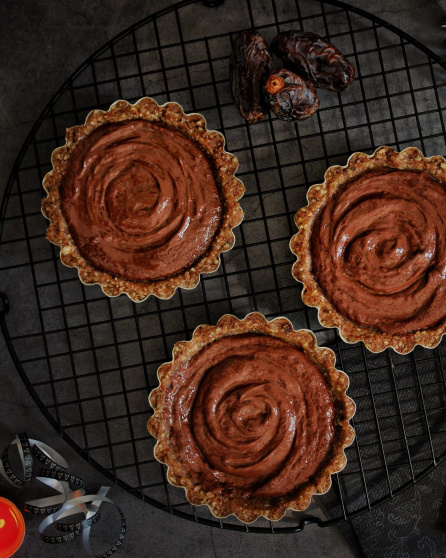In a small pan, gently melt all the ingredients together, on a low heat. If necessary, add a tablespoon of water and use a hand blender to get a creamy and homogeneous cream. Fill in the tartlets with the chocolate ganache.