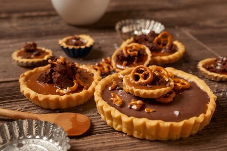 For the chocolate cream filling, roughly chop 2 tablets of Sweet Nibs & Sea Salt and place in a small bowl. Bring the coconut milk to the boil in a small saucepan, pour over the chocolate. Stir until the chocolate melts and combines with the coconut milk. Pour the chocolate cream over the caramel layer in the tartelettes, decorate with sea salt and salted pretzels and chill.