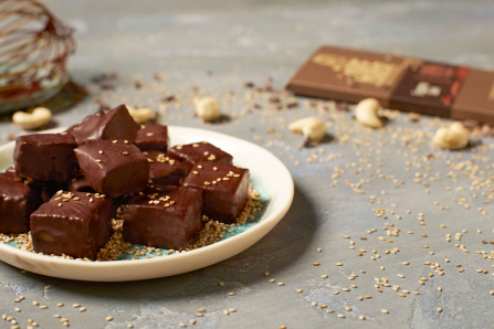 Coarsely chop half a Extra Dark 99% tablet. Remove the cashew mixture from the blender, incorporate the chocolate pieces into the mixture, spread out with wet hands to form a 2 cm high rectangle of about 20 x 25cm and chill for at least one hour.