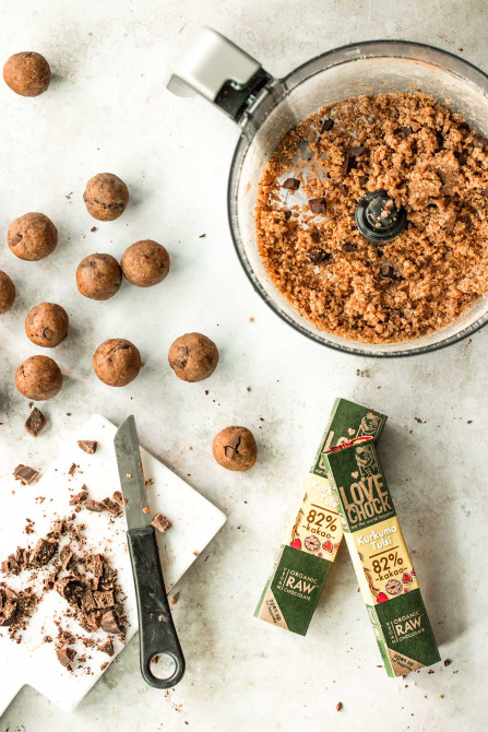 - Using a knife, chop the Lovechock bar "Turmeric Tulsi" into small pieces. The chocolate chunks can be placed in the dough. The bar "Turmeric Tulsi" is very aromatic and is slightly perfect for the tasty aromatic tiger nut bliss balls.