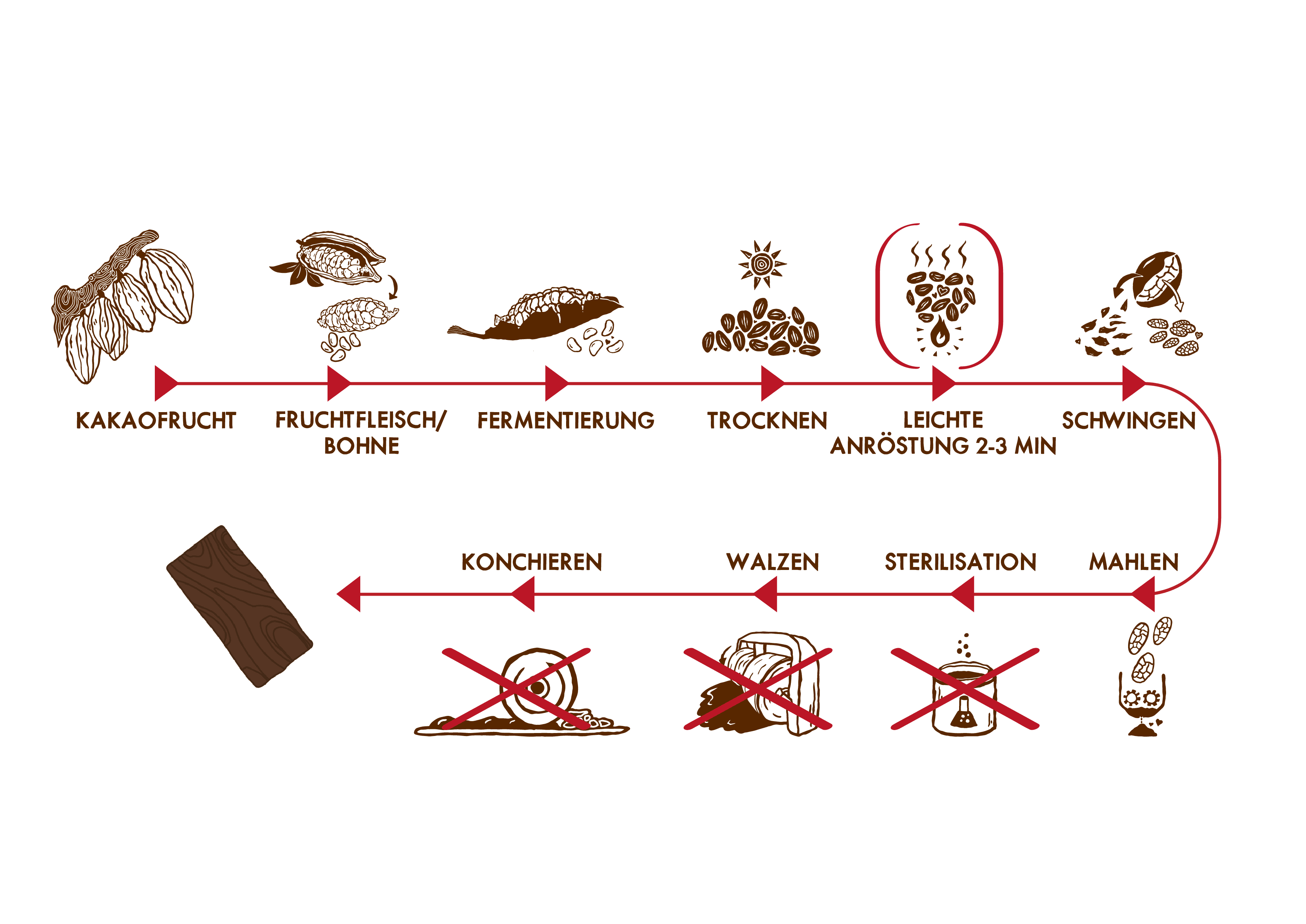 Alles beginnt mit dem Ernten der reifen Kakaofrüchte (1), aus denen nach dem Öffnen die in Fruchtfleisch eingebetteten Bohnen herausgelöst werden (2). Diese werden dann zum Fermentieren in Holzbottiche gelegt und mit Bananenblättern abgedeckt. Dieser Prozess kann je nach Saison 3-5 Tage dauern (3). Danach werden die Bohnen in der Sonne oder im Schatten getrocknet (4) und anschließend bei hoher Temperatur ca. 30-50 Minuten lang geröstet (5). Nun werden die Bohnen von ihrer Schale getrennt (6) und grob zu Kakaomasse vermahlen (7). Die Kakaomasse wird normalerweise noch mit heißem Dampf oder sogar chemisch sterilisiert (8). Zu guter Letzt wird der Kakao (meist zusammen mit Zucker, Milchpulver und Kakaobutter) noch feiner zermahlen (9) und dann für bis zu 72 Stunden conchiert (10), um die Schokolade weich zu machen.